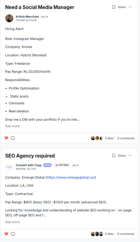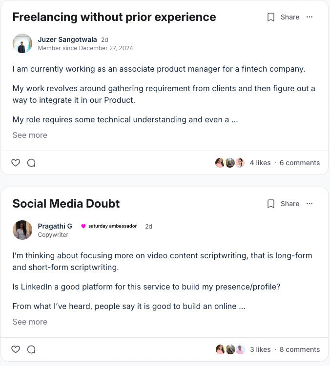 saturday. is an initiative by Convert with Copy (a lead gen agency) to help individuals find their place in this growing creator's economy.The creator industry is estimated to grow 5x and reach the $500B mark by 2030, and people with a brand and understanding of social media + AI will be at the top of the food chain. The community aspires to help people with no idea about marketing and social media make their first $ online.We are currently helping creators boom on LinkedIn.Soon starting with Instagram and X.